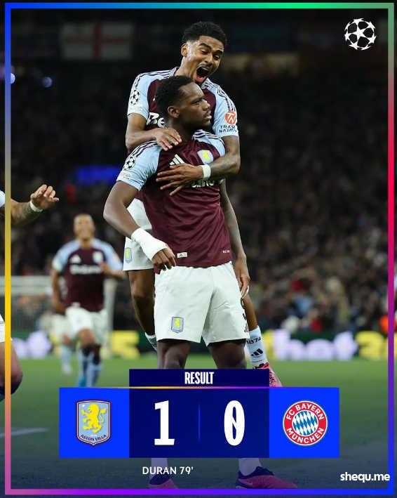 下半场替补登场的杜兰禁区外吊射世界波攻破诺伊尔十指关,补时格纳布里错失单刀。维拉门神大马丁7次扑救,力保零封。