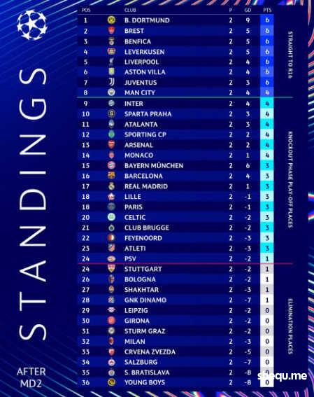 多特、本菲卡、尤文、维拉等7队两连胜,拜仁、皇马、巴萨、马竞、大巴黎等1胜1负,米兰、莱比锡、赫罗纳等8队两连败。