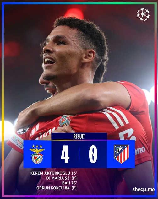 上半场阿克图科格鲁推射首开记录,利诺和帕夫利迪斯各射中门柱。下半场本菲卡两获点球,迪马利亚和科克曲打进,亚历山大巴头球又添一分,马竞客场0-4惨败。